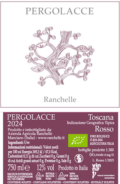 Pergolacce Rosso comes from a one-hectare vineyard planted in 2015 on land historically used for grains and legumes in the hills of Poggio Murella.