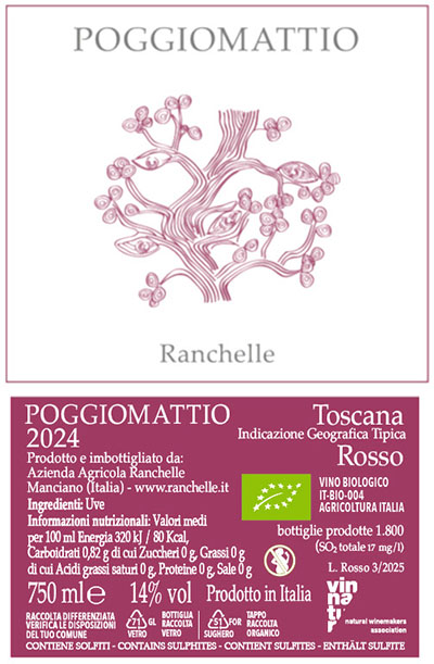 Red wine from a selection of Ciliegiolo vines grown in the highest vineyard at Poggio Mattio, naturally fermented on native yeasts with long ageing in tonneau.