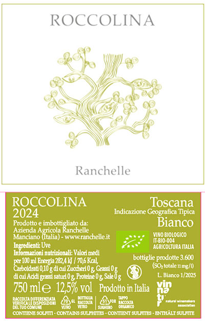 Roccolina Bianco combines the substance and light tannic grip of a brief skin-contact white with the freshness and aromatic lift of a classic white wine. Even without oak ageing, it has enough body and structure to evolve gracefully in bottle for several years.